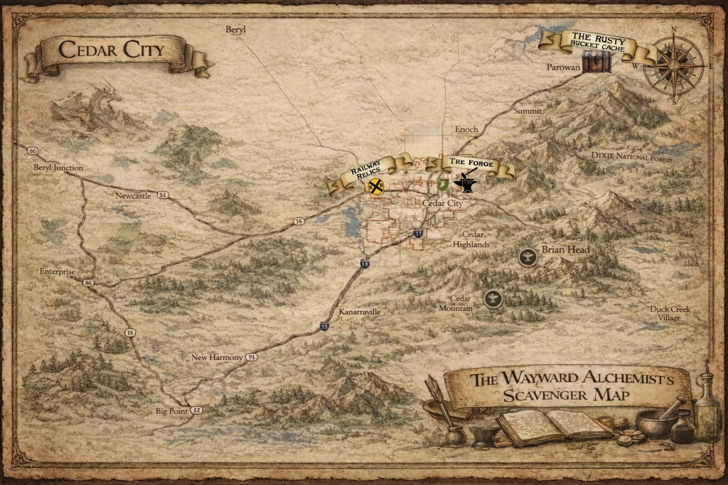 I don’t buy my steel from a factory. I hunt it in the salvage shops, ruins, and hills of Southern Utah. Follow the coordinates of the Wayward Alchemist’s sourcing runs. Each pin represents a site of reclaimed iron or scrap steel used in our current collection. Find your artifact’s origin and claim a piece of Southern Utah history