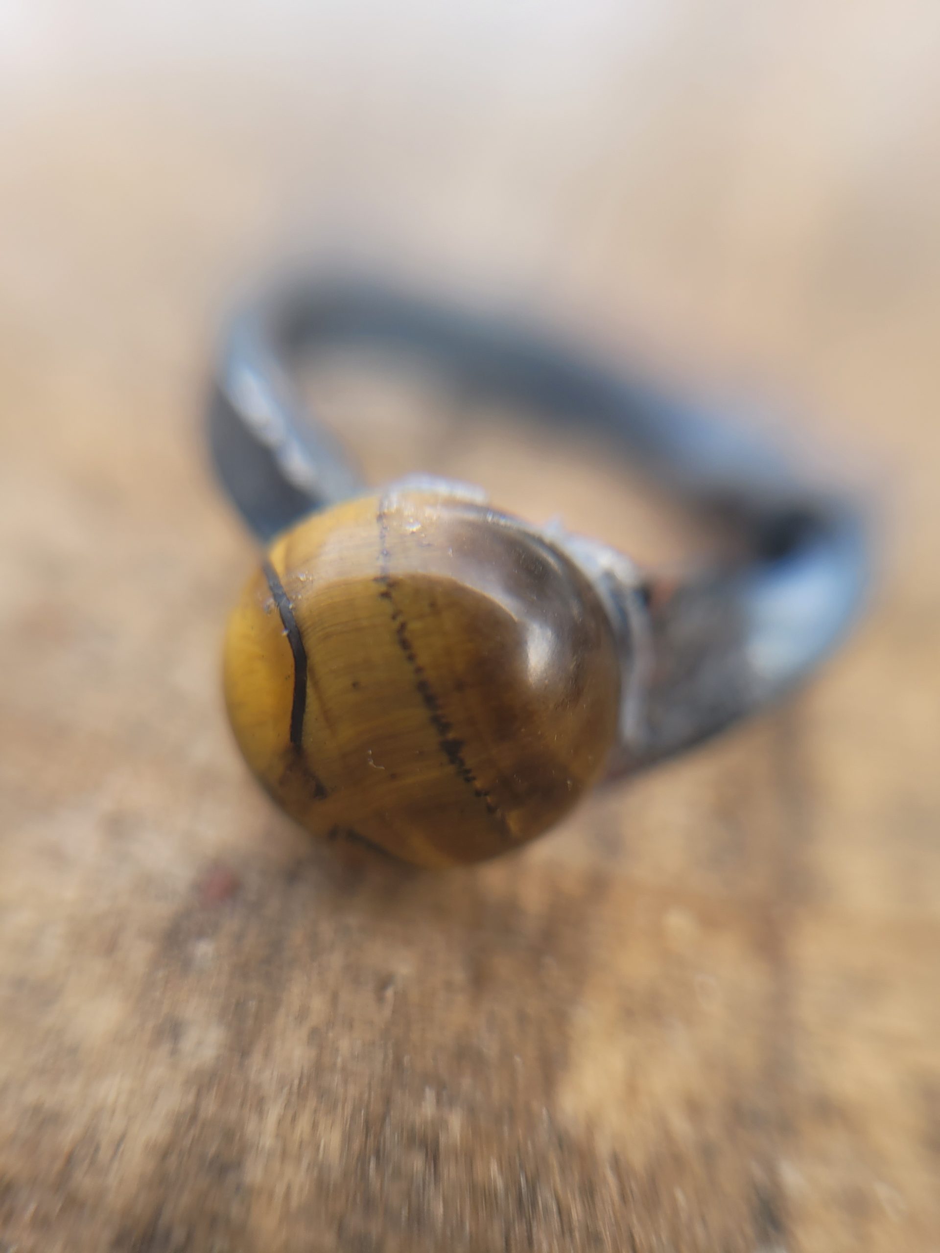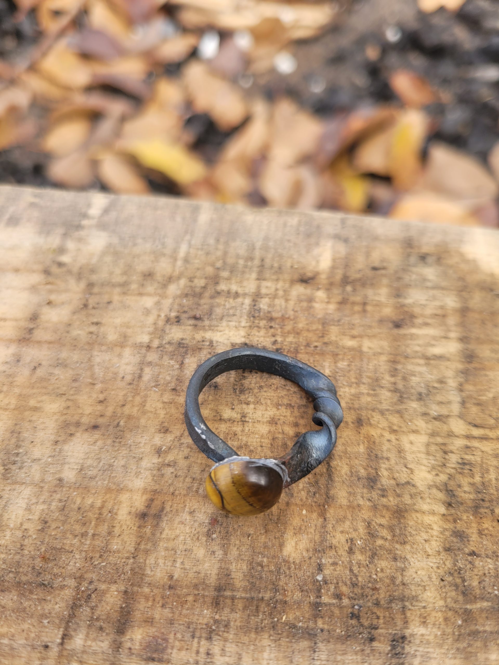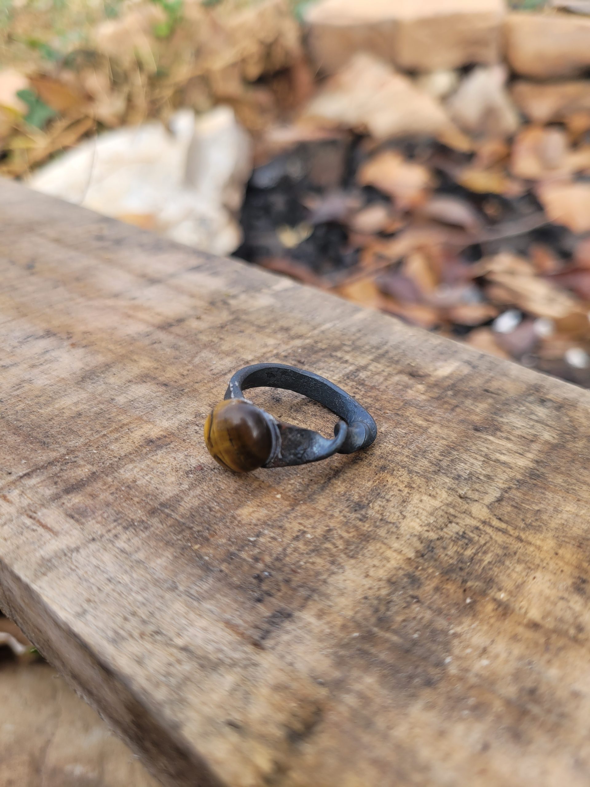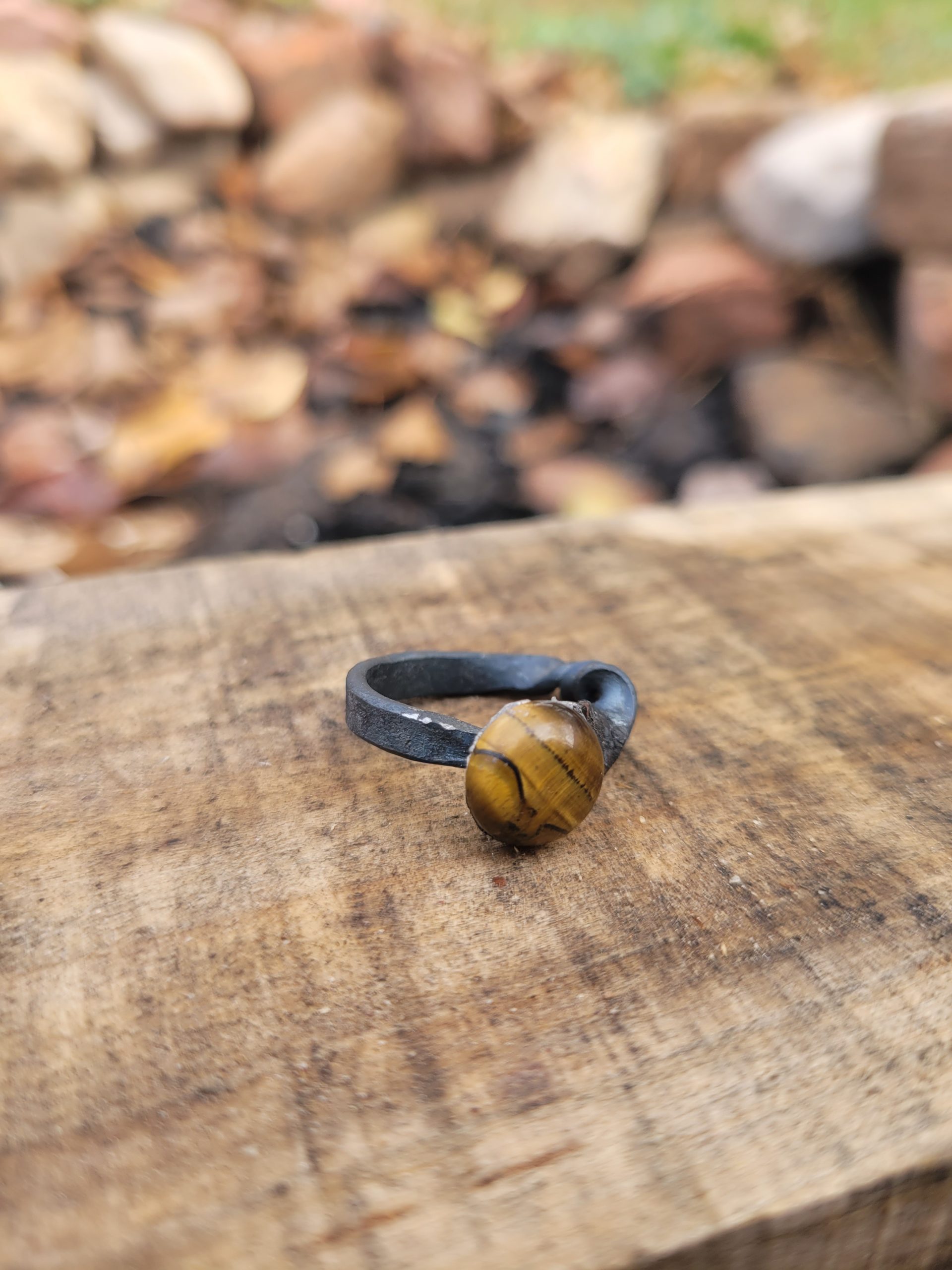A hand-forged ring crafted from a reclaimed steel nail, crowned with a Tiger’s Eye stone.