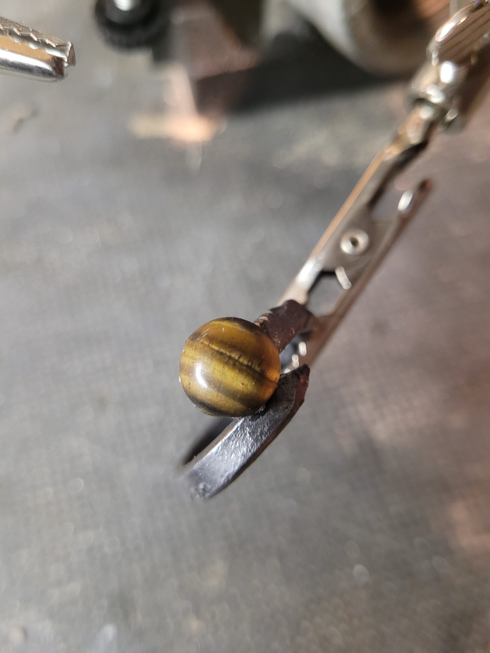 Materials: Reclaimed Iron Nail (Sourced from Parowan, UT), Polished Tiger’s Eye Cabochon.