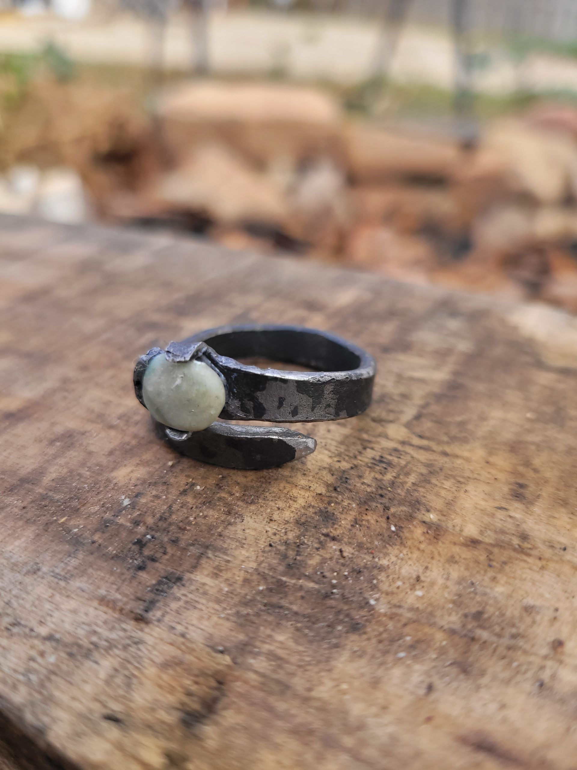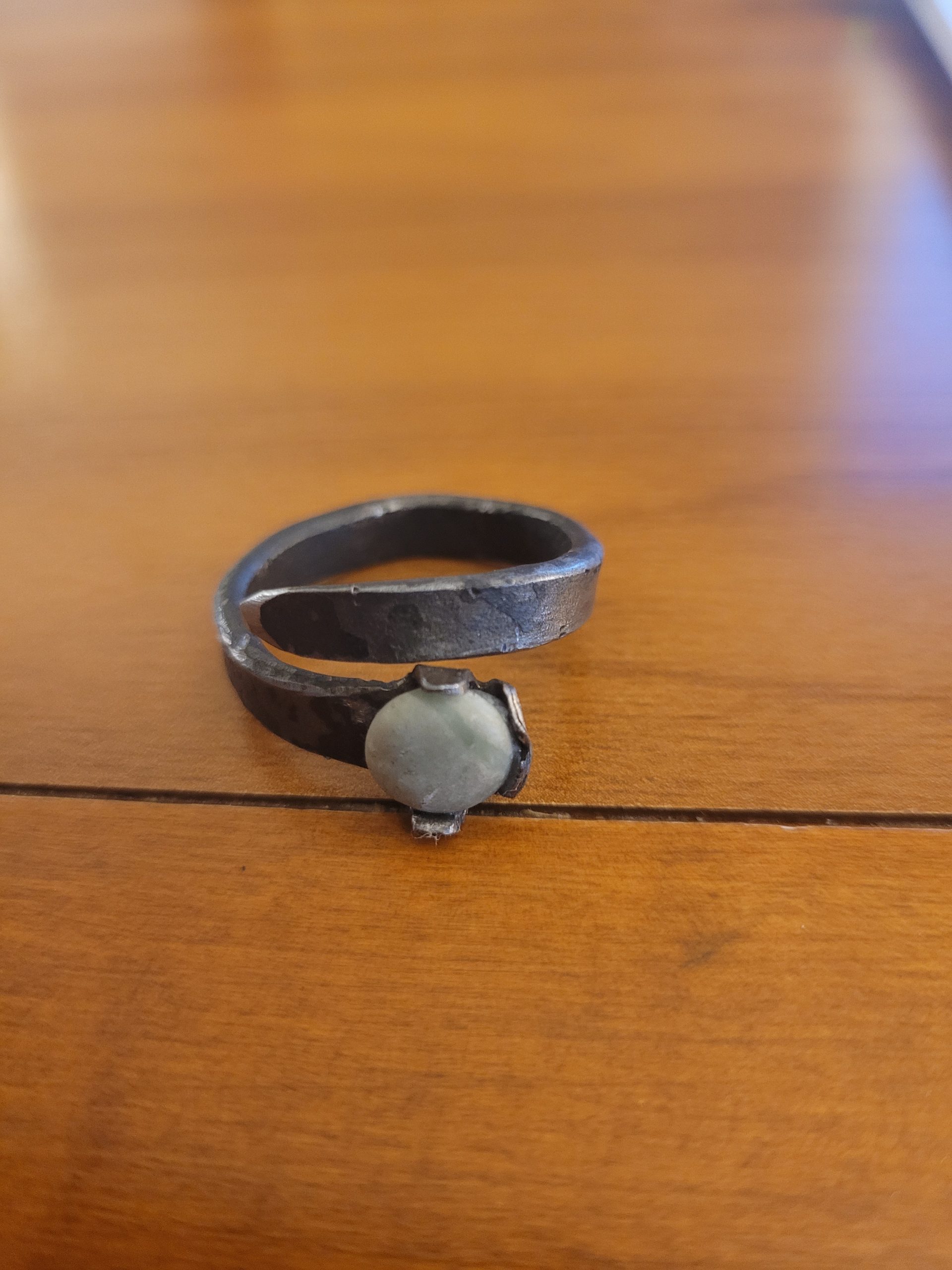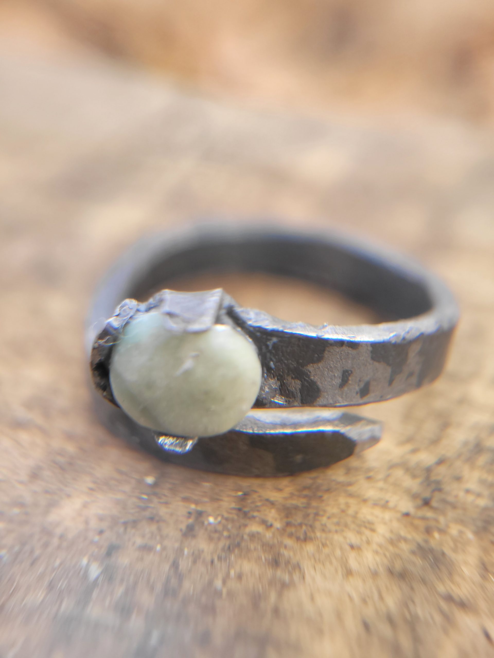 It was hand-forged from a thin iron nail; a piece of the mundane world meant to ward off wild magic and evil. The iron was drawn into a thin, rounded band with an overlapping, open wrap. The overlapping bands represent parallel paths. One of our realm, one of the hidden realm. The path of our realm is set with a Jade, the revered Stone of Heaven, deliberately chosen because its stability was thought to keep the traveler’s soul tethered to the mortal realm, and holds vitues of protection. Held by the three-prong setting (the three necessary stops on any journey: The River, The Shelter, and The Crossroads), this ring acts as a powerful charm.