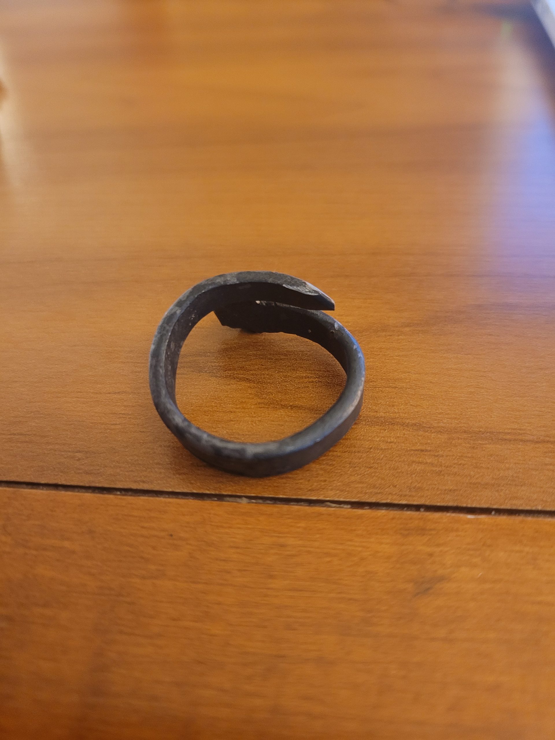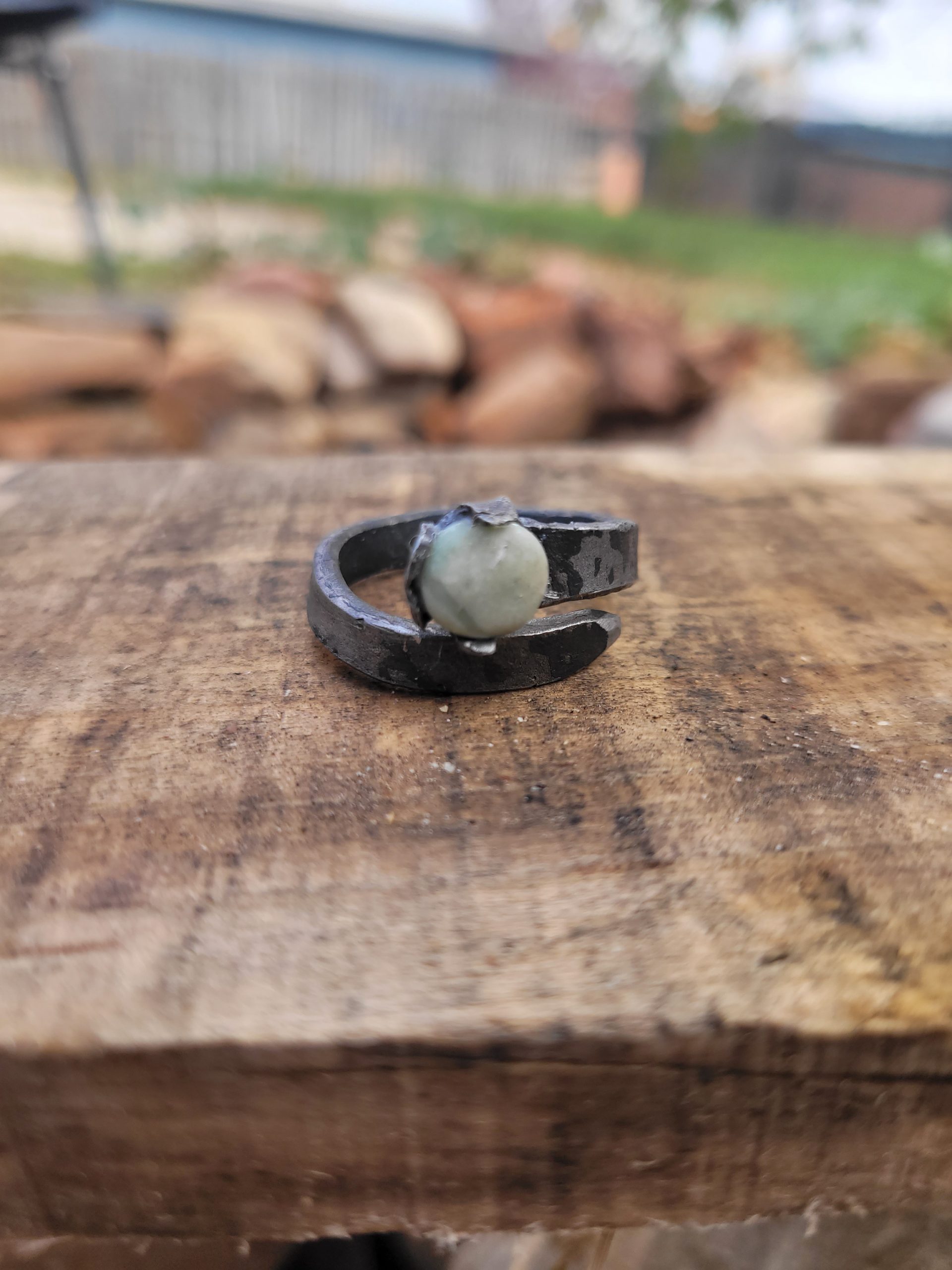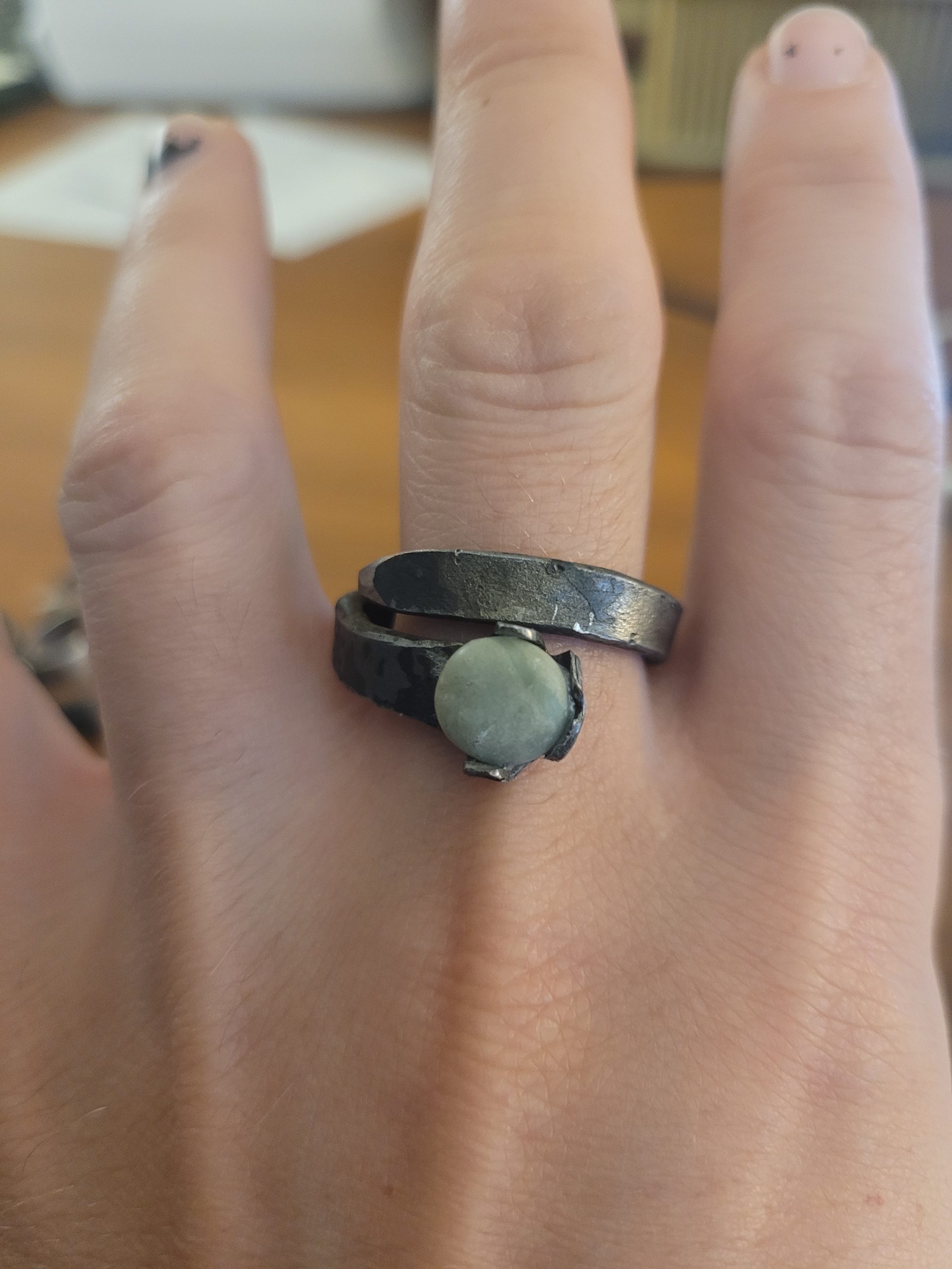 It was hand-forged from a thin iron nail; a piece of the mundane world meant to ward off wild magic and evil. The iron was drawn into a thin, rounded band with an overlapping, open wrap. The overlapping bands represent parallel paths. One of our realm, one of the hidden realm. The path of our realm is set with a Jade, the revered Stone of Heaven, deliberately chosen because its stability was thought to keep the traveler’s soul tethered to the mortal realm, and holds vitues of protection. Held by the three-prong setting (the three necessary stops on any journey: The River, The Shelter, and The Crossroads), this ring acts as a powerful charm.